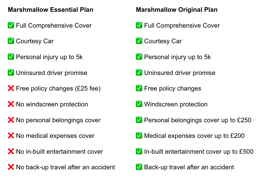 Marshmallow Essential is our budget motor cover option, giving you essential car cover, at a lower price. To provide this cheaper cover, Marshmallow Essential does not include some of the extras that you can get with the Marshmallow Original or Plus policy.